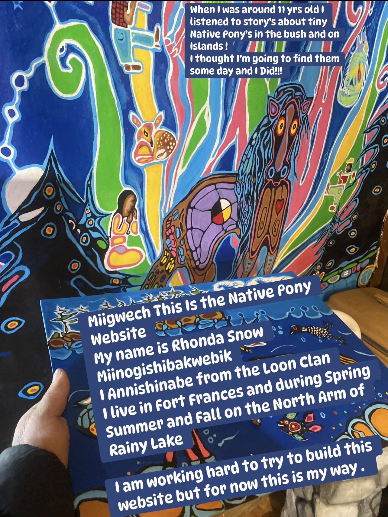 Boozhoo Welcome. My Native name is Miinogizhibawkebik. Thanks for stopping by this website in progress. This is the website about sharing and giving back. Like the trail of the Native Pony! I will add as I go. The Trail is getting cleared around muds swamps and deep snow! The Native Pony trusted Creator put their heads down and go. Miigwech ! we will post as we go, Giga waabamin!